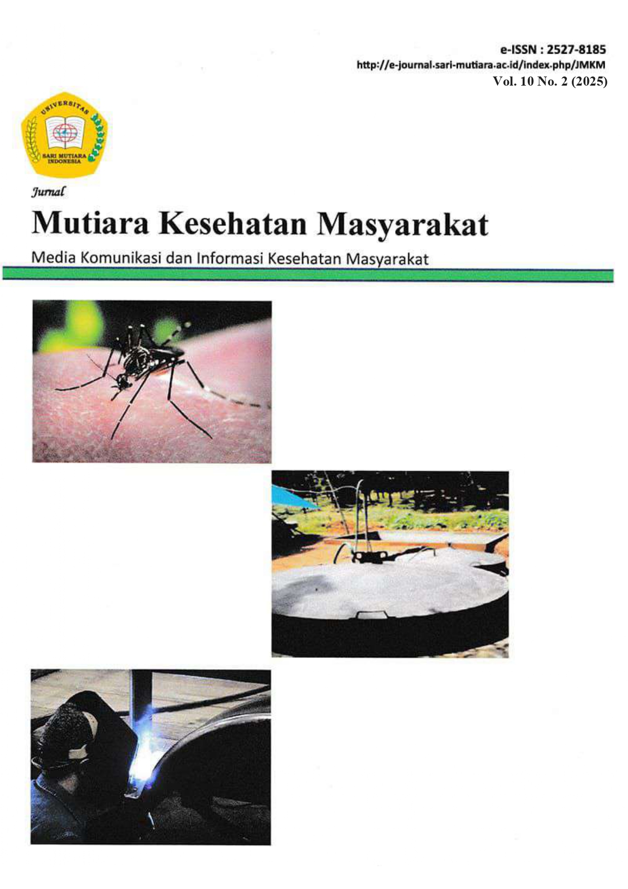 Vol. 10 No. 2 (2025)Jurnal Mutiara Kesehatan Masyarakat dikelola oleh Program Studi Ilmu Kesehatan Masyarakat Fakultas Farmasi dan Ilmu Kesehatan, Universitas Sari Mutiara Indonesia, merupakan salah satu wadah bagi para dosen dan mahasiswa baik dilingkungan kampus maupun di luar kampus untuk mengisi tulisan ataupun artikel hasil penelitian dan rekayasa teknologi kesehatan masyarakat, khususnya khususnya penyakit berbasis lingkungan, masyarakat dan kesehatan kerja. Jurnal Mutiara Kesehatan Masyarakat merupakan jurnal yang memuat tentang ilmu kesehatan masyarakat serta tulisan-tulisan hasil penelitian terkait administrasi kebijakan Kesehatan, epidemiologi, kesehatan dan keselamatan kerja, kesehatan lingkungan, kesehatan reproduksi, biostatistik dan promosi kesehatan dan ilmu perilaku. Terbit dua kali dalam setahun yakni di bulan Juni dan Desember. Jurnal Mutiara Kesehatan Masyarakat Memiliki ISSN: 2527-8185 (media online) dan Terakreditasi SINTA 5