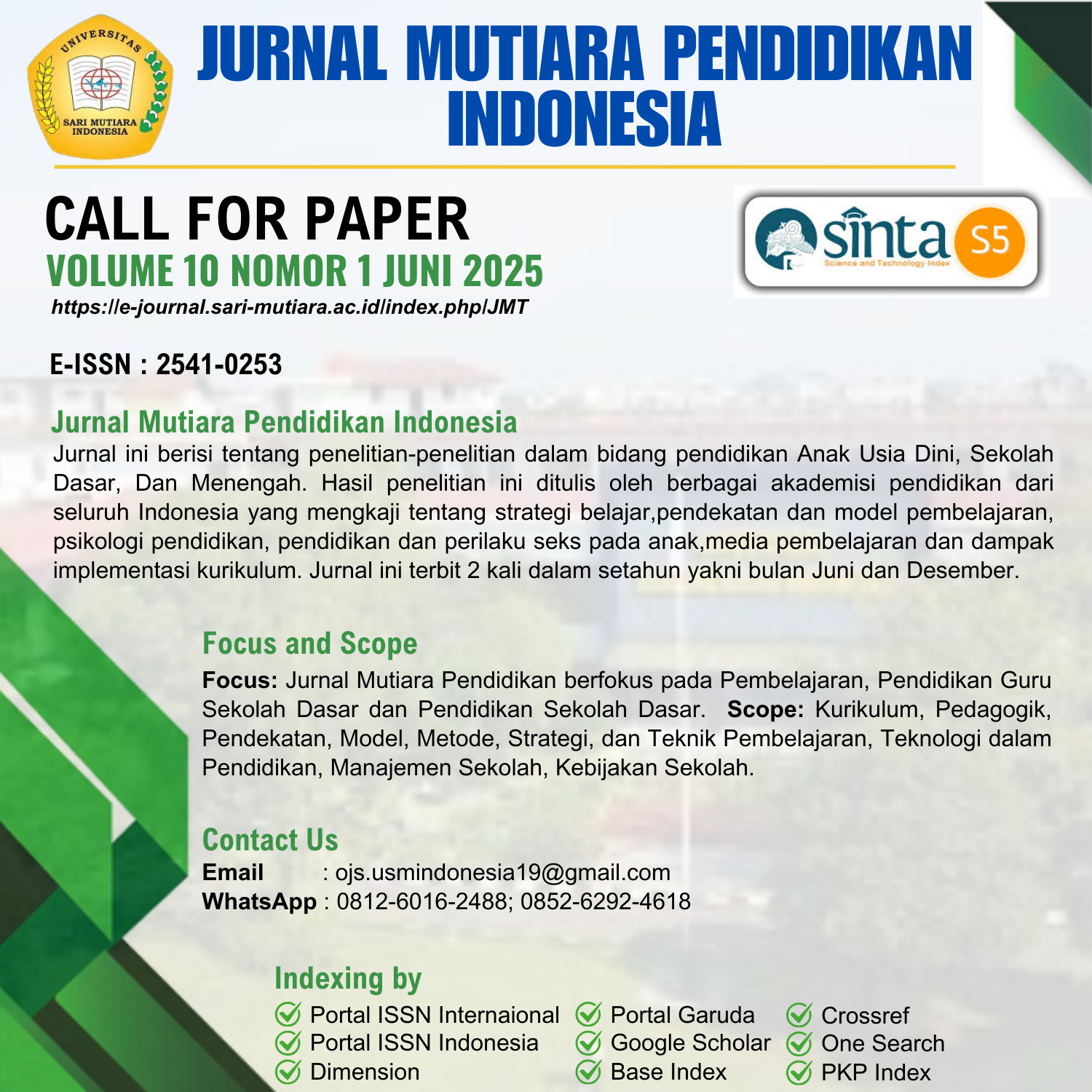 Jurnal Mutiara Pendidikan Diterbitkan oleh Program Studi Pendidikan Guru Pendidikan Sekolah Dasar Fakultas Ilmu Pendidikan Universitas Sari Mutiara Indonesia